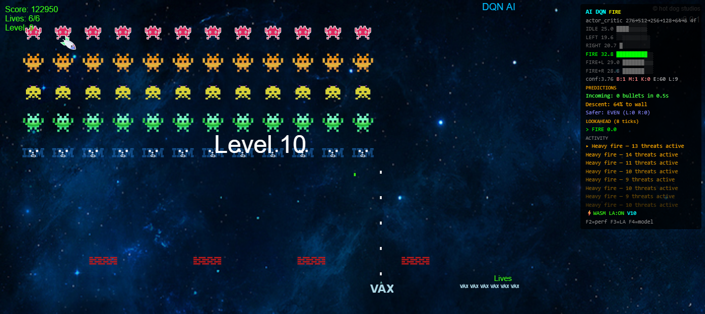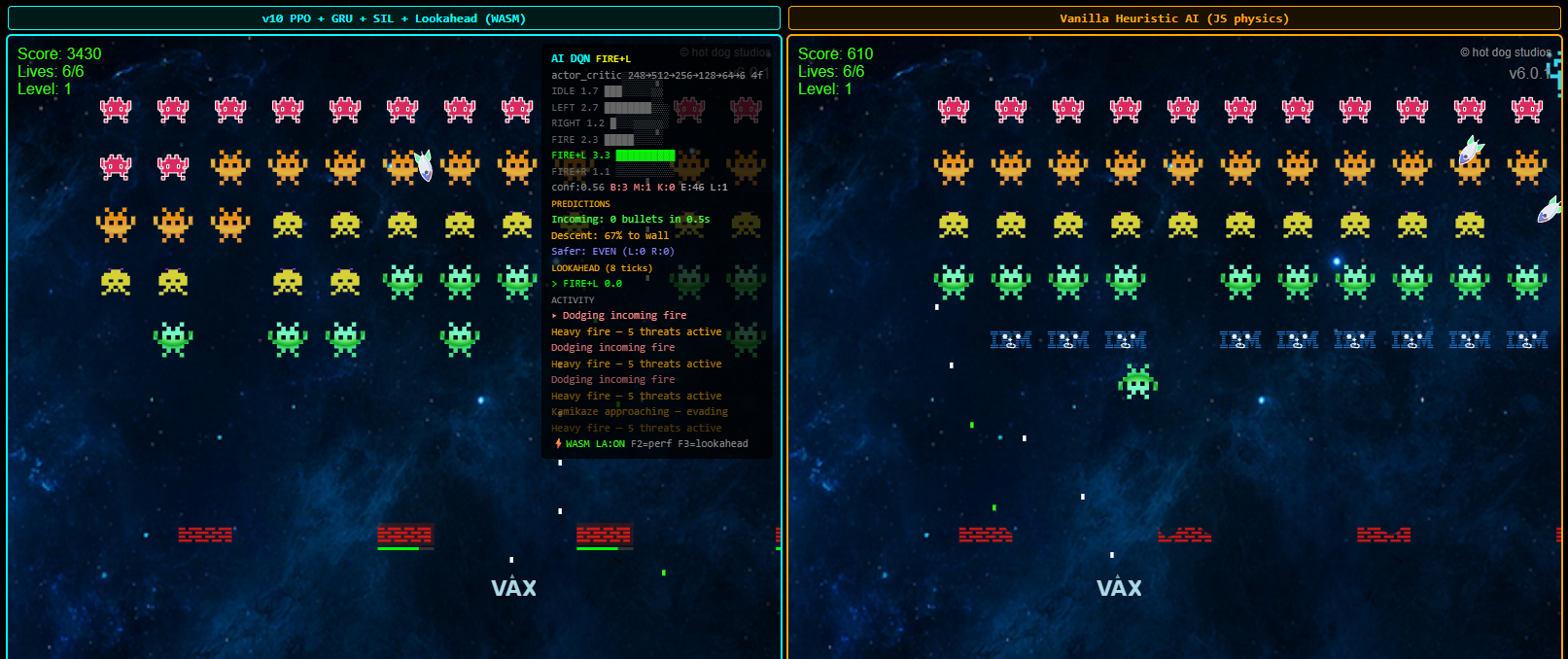 It was ineffective. The agent learned to fire — shooting enemies produces immediate positive reward — but could not dodge. The reward signal for survival was too diffuse. The agent couldn't connect "moving left three seconds ago" with "not dying now."