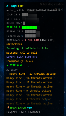 Before training any neural network, we built a rule-based AI agent. It performed trajectory forecasting — simulating bullet, missile, and kamikaze paths in 4ms time-steps to evaluate candidate positions. It checked eight strategic positions, scored them by danger level, and moved toward the safest one while lining up shots.