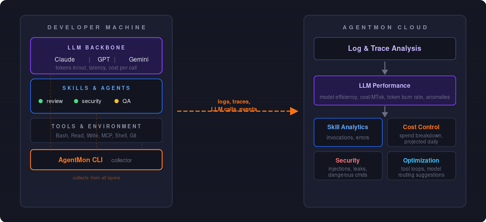 AgentMon collects telemetry from every agent session on your machine and streams it to a central dashboard: